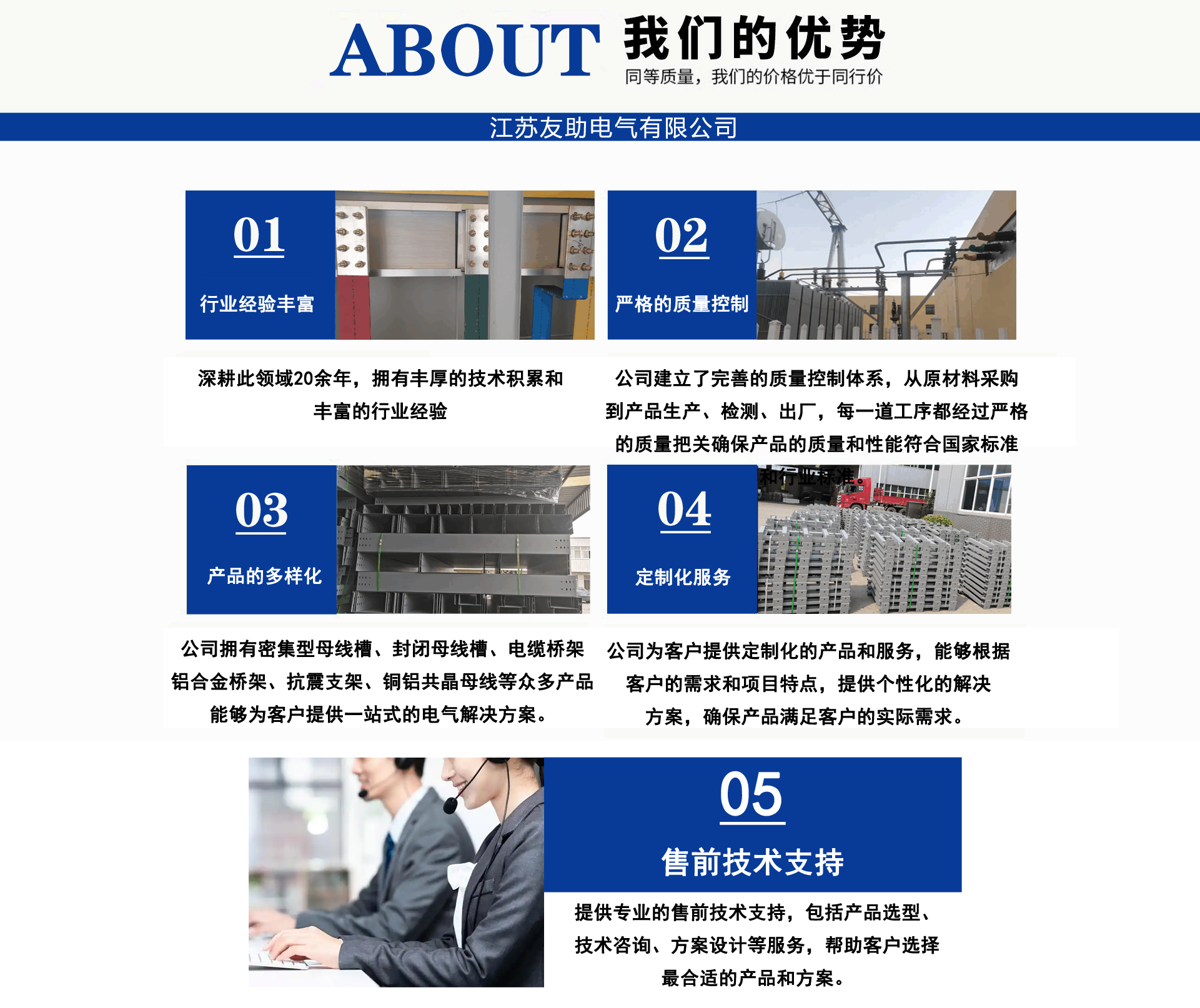 江蘇友助電氣有限公司地處中國(guó)工程電氣生產(chǎn)基地-一江蘇省揚(yáng)中市。經(jīng)營(yíng)范圍:電纜橋架,母線(xiàn)槽(橋),管型母線(xiàn),銅軟連接(伸縮節(jié)),高低壓開(kāi)關(guān)柜,配電箱,抗震支架產(chǎn)品系列。 公司宗旨:客戶(hù)至上。已成功為江蘇二十屆省運(yùn)會(huì)會(huì)場(chǎng)-泰州體育館,南京寶龍商業(yè)綜合體,張家口百兆瓦風(fēng)電場(chǎng),濟(jì)源市婦幼醫(yī)院,威海市未來(lái)科技園,湖北皇恩燁新材料科技有限公司,南京中央路小學(xué),南通中天大酒店,新疆新安特鋼有限公司,河北省送變電有限公司,南京南微醫(yī)學(xué)研發(fā)基地等多項(xiàng)工程配套服務(wù),我們?cè)概c您精誠(chéng)合作,互利共贏!公司技術(shù)人員深耕橋架,母線(xiàn)領(lǐng)域30年,為您提供橋架,母線(xiàn)槽疑難問(wèn)題解決方案。母線(xiàn)槽不論每相是單排,雙排,三根排重疊,不管有多少個(gè)水平彎、垂直彎,轉(zhuǎn)接排在發(fā)貨前預(yù)裝一遍,確保尺寸無(wú)誤。到現(xiàn)場(chǎng)直接擰螺絲,效率高,橫平豎直,規(guī)規(guī)矩矩,符合標(biāo)準(zhǔn),供電局,業(yè)主,監(jiān)理,驗(yàn)收易通過(guò)。供貨周期3-7天。為了讓尊貴客戶(hù)您,設(shè)備安全通電,高枕無(wú)憂(yōu)。我們提供如下售前售中售后服務(wù): 售前:免費(fèi)技術(shù)支持,咨詢(xún)。 售中:免費(fèi)現(xiàn)場(chǎng)精確測(cè)繪、設(shè)計(jì)。 售后:安裝服務(wù),免費(fèi)指導(dǎo)。 質(zhì)量是生命,客戶(hù)是源泉。承諾客戶(hù)的,一定全力做到。讓我們一起進(jìn)步!...